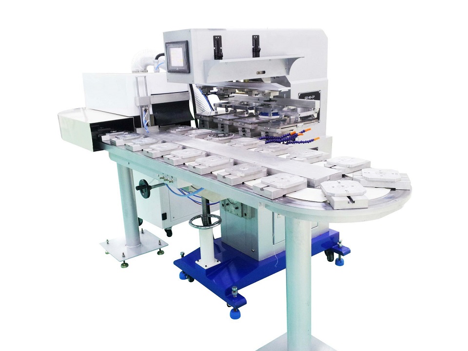 四色油盅烤箱轉盤移印機專業適合金屬、玻璃、陶瓷、塑膠、木材、皮革等材質的印刷面積比較小的平面、弧面以及不規則面產品的精密印刷。如手機按鍵、高爾夫球及球頭、玩具、筆、鼠標、電子產品、工藝品、鞋跟等等。